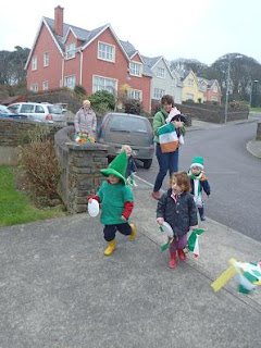 Then we all got our wellies on and donned some very wonderful Patrick's day paraphernalia that Susan had brought and we headed off to the woods for our very own parade.