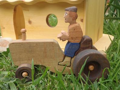 He made these amazing tractors from one piece of wood, the farmer slides in and out and the wheels turn and are going to drive miles across carpeted fields.