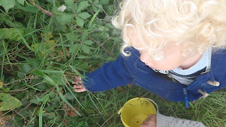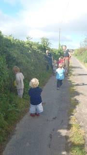 So today was our first 'proper' Buddies session and our theme was Blackberries. After our welcome song we tugged on our shoes and headed off up the road to a quiet lane with a wild hedgerow.