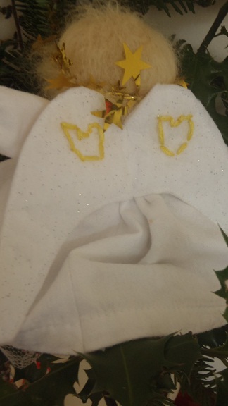 body, head and wings made by Rebe, dress made by me and Benny and all threads snipped by Joa.