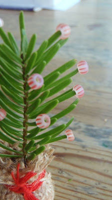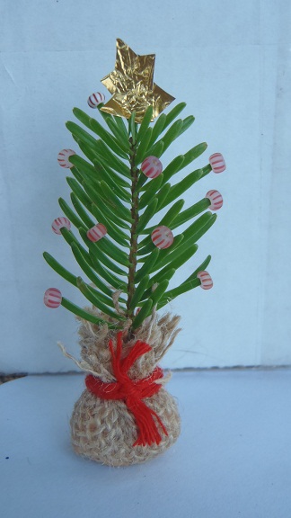 pull off the needles at the bottom about an inch up your treestick your tree into a little plop of playdough, or you could use modeling clay or even bees wax