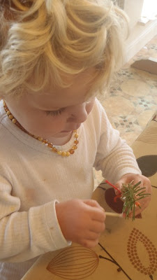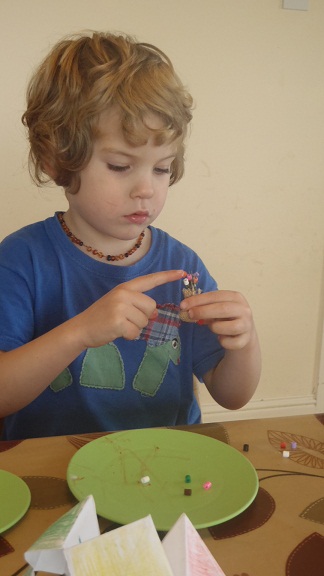 and oh so carefully chose their beads and threaded them onto the needles. Joa especially enjoyed this as he practiced all the colours he knows (which really is just pumpkin for orange and blue for everything else)