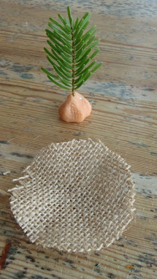 place your tree in the middle and gather the burlap up over the playdough and secure around the trunk with some cotton, yarn or strong thread.