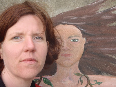 They decided to stay over so the four older kids all camped out on the playroom floor while the 2 wee ones were put to bed upstairs. This left Lucy and I deliciously free to talk for hours. I love spending time with Lucy, she is so awesome and creative and so full of colour and energy. I always feel inspired when I am with her. She left this morning as I was taking the kids to Andy and when I came home I really felt I wanted to paint.This wall at the end of the garden seemed like it was needing some colour and I had the idea to paint a garden goddess to watch over our garden and all the wonderful and exciting things growing (and playing) in it this year.
