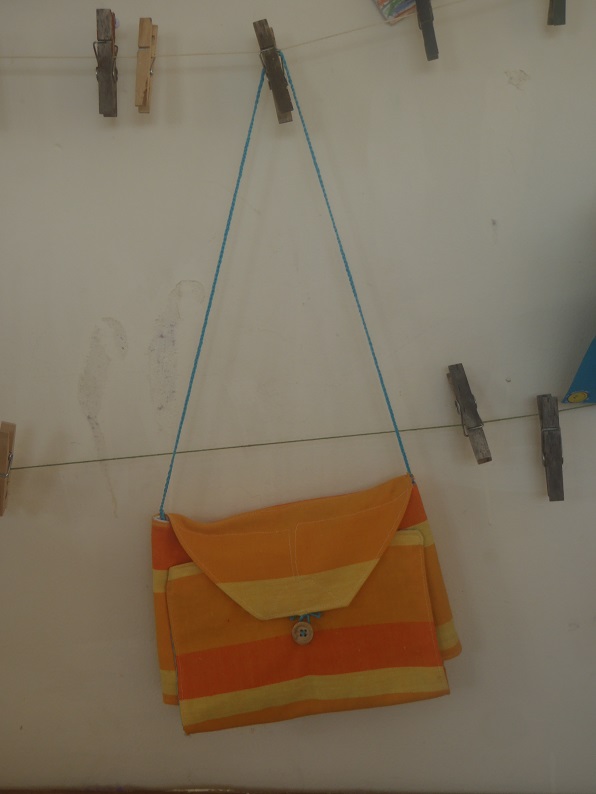 | it folds up and buttons with a little wooden button like a handbag |