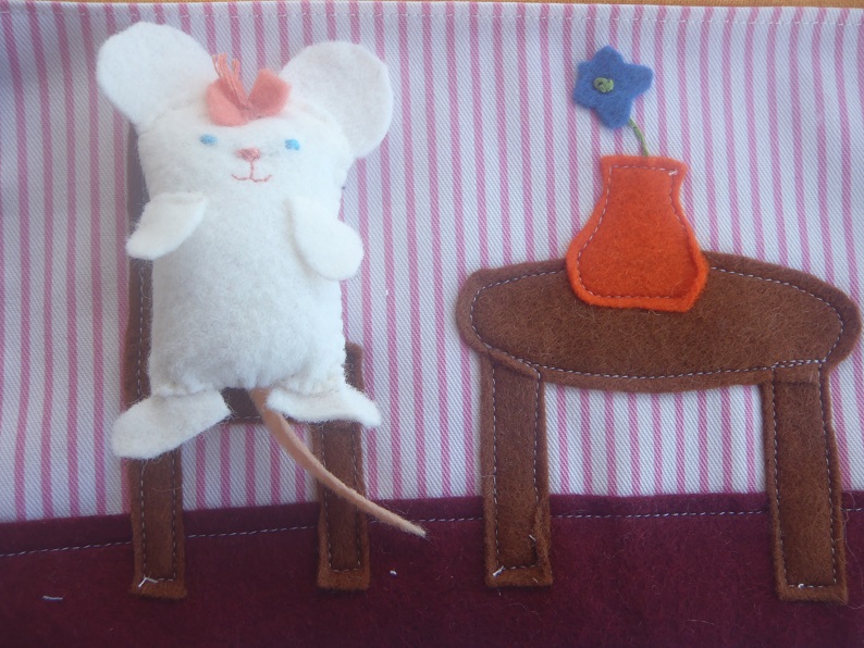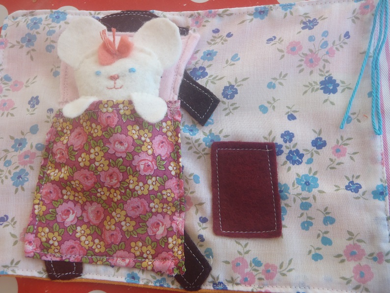 I probably had way too much fun making this gift. I used lots of scraps of felt and fabric. The mouse herself is white felt stuffed with a little sheep's wool. I designed each room on paper then found the right pieces of fabric and machined them all together. The whole thing is backed on a firmer weave fabric to give it a bit of strength and durability.