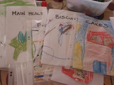 I'm always looking for ways to recycle the children's pictures, so I have used some of them as dividers. I put all my recipe scraps into the the pockets and all into some kind of order.
